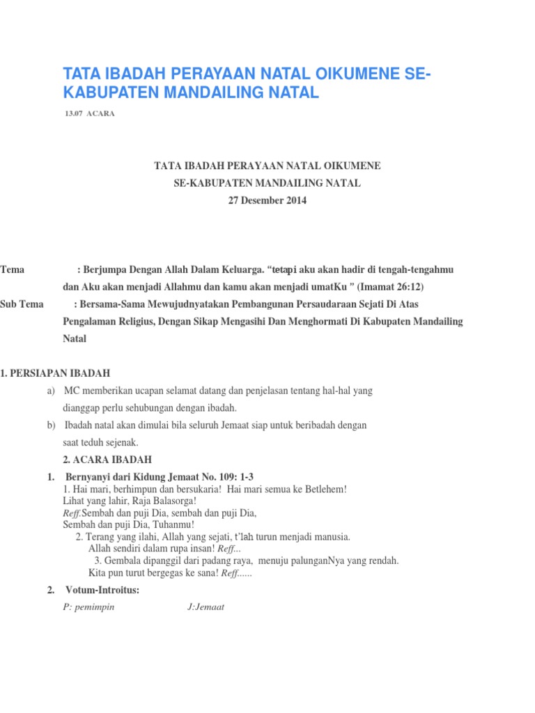 Kpi 8 di gkii lempah 1 tempunak sintang. Beka menilai pelarangan merayakan natal dan ibadah bersama oleh pemerintah kabupaten dharmasraya dan sijunjung merupakan tindakan diskriminatif. Tata ibadah tahun baru 2017. Persiapan perayaan natal dibutuhkan beberapa minggu sebelum acara tersebut di laksanakan, salah satunya adalah penyusunan lagu lagu mulai a. Sedangkan liturgi atau tata ibadah gereja merupakan aturan atau sistem yang harmonis, sistematis, fungsional, logis, dan dinamis;